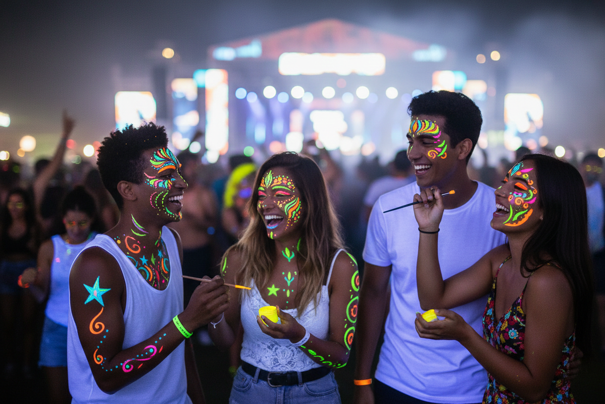 Peinture fluorescente UV Glow Paint (visage & corps) – effet néon pour soirées et festivals. Transforme votre look en expérience lumineuse et photogénique sous lumière UV. Produit proposé par KRAAA, conçu pour l’impact visuel et la création de souvenirs mémorables.