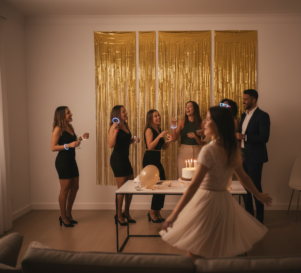 Rideaux Franges Métalliques doré – Lot de 3 (1x1 m ou 2x1 m).Décoration de fond brillante et festive, idéale pour créer une ambiance événementielle instantanée. Effet visuel premium et installation facile. Produit proposé par KRAAA, parfait pour anniversaires, soirées et décors photogéniques.