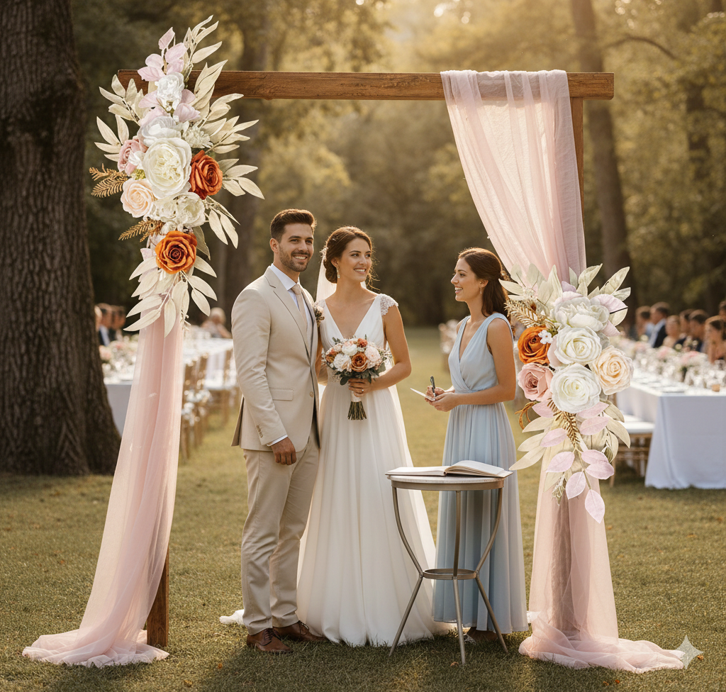 DIY wedding, cérémonie, événement, décoration de maison, hôtel, table et arche métallique.